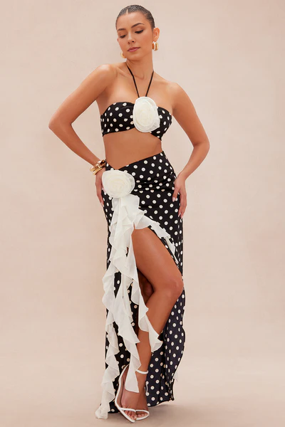 A stunning two-piece set featuring a satin top with padded bra cups, Y-neckline, grip tape, and smocked back with zipper closure. Paired with a satin maxi skirt adorned with ruffle trim, floral appliques, and hidden zipper closure. Finished in a playful polka dot print for a timeless, elegant look.