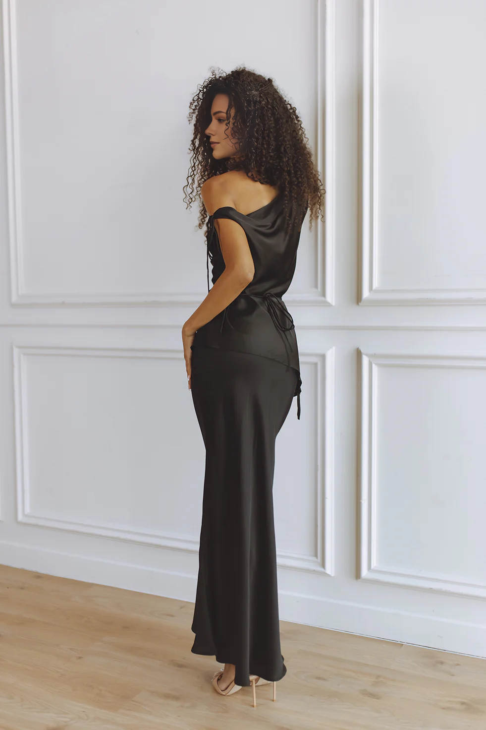A fluid off-white satin maxi skirt with a versatile drawstring waistband for polished or relaxed styling. The softly flared hemline adds graceful movement and timeless elegance.