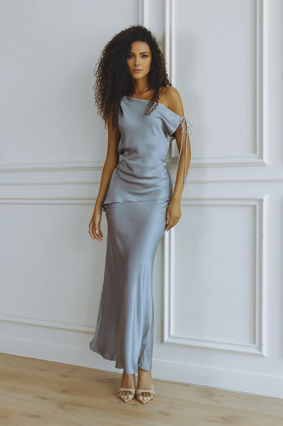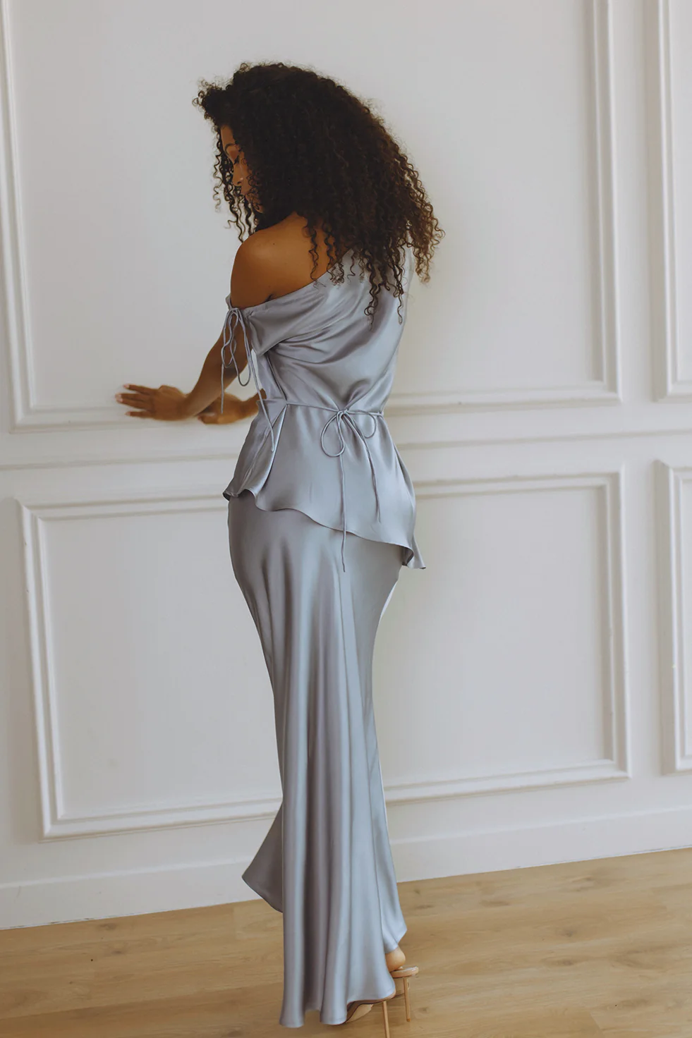 A fluid off-white satin maxi skirt with a versatile drawstring waistband for polished or relaxed styling. The softly flared hemline adds graceful movement and timeless elegance.